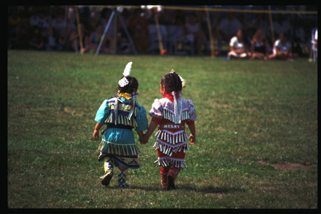Nachdem der Tanzring von einem Medizinman gesegnet wurde, beginnt das Pow Wow mit dem Grossen Einzug. Dabei wird der Adlerstab vom Ältesten in einer Prozession in die Mitte des Tanzrings gebracht. Angeführt wird diese Prozession von den Kriegsveteranen. Heute sind dies Indianer, welche in Vietnam, Korea oder im Zweiten Weltkrieg gekämpft haben. Die Veteranen tragen die Flaggen der USA, Kanadas und der Indianischen Nationen in den Ring. Gefolgt werden sie von den Ältesten mit den Adlerstäben, dann von den Prinzen und Prinzessinnen und am Schluss von den Tänzern. Genaustens wird die Nummer jedes Tänzers aufgeschrieben, denn nur diejenigen, welche am Grossen Einzug teilnehmen, sind nachher am Wettkampf zugelassen. Die Prozession schreitet in Sonnenrichtung, also im Uhrzeigersinn zum Rythmus der Trommeln dahin. Die Trommeln sind sozusagen der Herzschlag des Pow Wows. Um jede Trommel sitzt eine Gruppe von Sängern. Jeder hat dabei einen Schläger, mit dem er den Rythmus des Liedes auf der Trommel mitschlägt. Die Hauptstimme beginnt mit dem Lied, und der Chor antwortet. Die Lieder waren früher jeweils in der Sprache des Stammes. Da aber heute diese Lieder von allen Stämmen benutzt werden, ersetzen die Sänger die Wörter oft durch Laute ohne dabei die Eigenart des Liedes zu verändern. An jedem Pow Wow gibt es jeweils eine Gast Trommel, welche nicht am Wettkampf teilnimmt und verschiedene andere Trommeln, welche um Punkte kämpfen. Nach dem Grossen Einzug wird mit den Tanzwettkämpfen begonnen. Angefangen wird dabei mit den Jüngsten jeder Kategorie. Es gibt auch eine Kategorie für die "Pee Wee", die Kleinsten, die fast kaum laufen können, aber trotzdem von den Eltern tiptop eingekleidet werden und sich mit ersten Tanzschritten versuchen. Genaustens wird auch hier von den Richtern die Nummer jedes Teilnehmers festgehalten. Zwischen den Wettkämpfen wird von Zeit zu Zeit zu einem Gemeinschaftstanz aufgerufen. An diesem Tanz kann jedermann teilnehmen. Würdig schreiten dabei Alt und Jung, Indianer und Nichtindianer im Kreis. Wenn nicht hie und da einer der beeindruckenden Indianer eine Sonnenbrille tragen würde, könnte man fast meinen in eine lang vergangene Zeit zurückversetzt worden zu sein. Manchmal wird der Gemeinschaftstanz unerwartet angehalten, um die Nummern der Teilnehmer aufzuschreiben. Somit erhalten die Tänzer, welche an den Gemeinschafts- und nicht nur an den Wettkampftänzen teilnehmen ein paar extra Punkte, welche zur Bewertung zählen. Neben dem Tanzkreis wird an Ständen mit Büffel-Burgern und Maisgerichten, Limonade und Coca-Cola auch für die Verpflegung gesorgt. Ganz so wie früher sind die Pow Wows also wohl nicht mehr, aber ausgedient haben sie noch lange nicht ! |