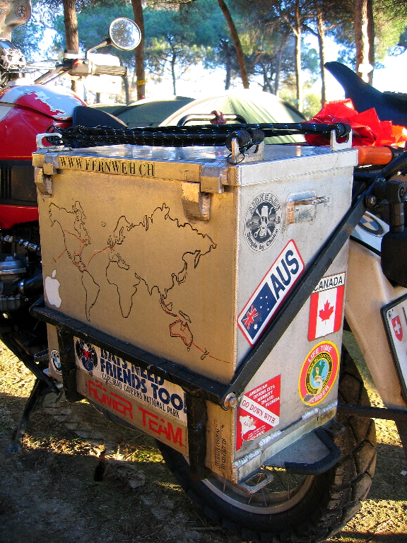 Aluminum boxes are almost a requisite for long distance touring. In our case I wasn't able to find boxes that fitted my very exacting demands for long distance touring, so I had some specially made. This was certainly not the cheapest alternative, but in the long run (almost 12 years, now) they have more than proven themselves. One of my major requirement for the boxes was that they have no holes. I have seen numerous boxes most of which have been riveted together and which usually have screws for the mounting brackets through the box. Eventually the vibration causes the rivets to enlarge the hole in the boxes, which then have to be re-riveted or otherwise plugged. The worst problem seems to be with the mounting bracket which when the bike crashes (and it will) landing on the box, causes the screws to be ripped through the box wall. Not a pretty sight and a real mess to fix. Another major item was the size. Sizes of boxes on the market vary greatly, but for my tastes they are generally too big. Mounting brackets, as already mentioned screws or bolts through the box are in my book a no, no. One of my favorites mounting techniques was employed by Helge Pedersen on his 10 year around the world journey. He used a plate welded to the box on which a circular tube was affixed this would fit through a bolt mounted on the bike. The whole thing held down by a nut and a small lock if memory serves. The system was designed so that the weak point was the bolt welded to the bike. When he crashed badly that would break hindering any further damage to the box. He said that on his journey he only had to have that piece re-welded 3 times. My boxes use a steel cradle in which the boxes fit. When the bikes go down this cradle keeps the boxes from ever touching the ground. It is extremely strong and still very lightweight. Some additional details, like a lid that opens outwards from the bike, mounting brackets for water or gas canisters, as well as numerous attachment points for bungee or straps, complete the setup.Last but not least I would like to say that all boxes have been designed with a particular purpose and function in mind. One of the foremost seem to be ease of removal, and aesthetics after removing the boxes. My boxes are easy to remove but the remaining cradle destroys the beautiful lines of the GS (no laughing now). In practice we have found that we practically never remove the boxes just to go riding around without them. We do remove the boxes quite frequently to use as chairs and a table when camping, and as soon as we are finished, re-mounted on the bikes.
