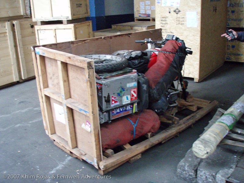 Overview Shipping a motorcycle from Kathmandu is pretty simple. There are probably over 100 shipping agents which will help you get rid of your money and get your vehicle to where you want to go. This being Kathmandu the general direction is Bangkok. I on the other hand wanted to get my bike shipped overland to India and from there by boat to South America. The reason for my decision to ship by boat rather than by plane was a financial one. A lot of people argue that the cost of waiting around for the bike to show up offsets this and in the end both are about the same price. I don't agree, and therefore did it this way. First step, find a reputable agent. Good luck!! I went around and spoke to a number of them in the Thamel area, I also did some research on the net. In the end my impression was that it was just luck of the draw. Some people would give one shipper high remarks, while two months later someone else would write something totally different, and no-one wrote about shipping by sea from Kathmandu. So in the end I went by gut instinct and chose the guy who had the nicest looking secretary. Who also happen to quote me a price which was in line with my expectations. The agent I chose, Sunrise Cargo in Thamel (sunrisecargo@wlink.com.np) had a nice office just up the road from the KGH (Kathmandu Guest house). Their main business is clothing manufacturing and exporting so they have experience with shipping freight (www.nepcloth.com). Mr. Bishwal Buddhi and his staff were very friendly and professional so in the end it was an easy choice. The name which shows up most often when shipping from Kathmandu is Eagle Eye Exports, I spoke to them but in the end they were both considerably more expensive and I simply didn't get a good impression. Procedure: Once everything was agreed on Mr. Buddhi sent his packer to my hotel to measure the bike so that he could purchase the wood. This was when the "problems" started. Measurements were taken, and I explained that the front wheel would be taken off and the whole bike compressed down with straps, and although they seemed to understand I wasn't all that sure. I also went to their place of business and we discussed the required materials. We made a few sketches and made some more measurements, in the end I felt I had made it clear what was required, so I had a pretty good feeling. The crating of the bike took place 4 days later. When they came to get me, they were carrying the panels pre built for crating the bike. Bad news, as I was sure they were not using my measurements, but rather their own. We drove to the warehouse/factory of Mr. Buddhi and there began to pack the bike (another plus, there was plenty of space to build/assemble the crate, and store the crate until the truck picked it up). Of course the measurements were incorrect, the result of which was that they had to take apart and rebuild a lot of their work. As they had no power tools they ended up having to do it by hand, and because of this the box ended up being around .5cbm larger than it should have been. In the end a pretty costly issue. I did manage to get it a lot closer that it would have been if they had just assembled what they had brought. But at this stage that was all that I managed. My previous effort to insure they used my measurements and not their own having failed. In addition, the wood they brought and with which they had pre-built the crate was pretty badly curved, and some of the boards were cracked. Nevertheless we proceeded and around 6 hours later it was done. On the 21 of May, once the bike was crated, I handed the Carnet De Passage (motorcycle bond/customs document) to Mr. Buddhi and this together with copies of my passport and vehicle papers, as well as a short packing list, and a paper giving him permission to export the bike in my name, was all that was required. The bike was put on a truck the following day and sent to the border. The bike landed in the port of Kolkata without any further delay. There it waited for a full container before the bill of lading could be filled out and returned. I decided to wait in Kathmandu until I had all the required paperwork, and was sure that the bike was on its way. This is of course not necessary as the paperwork could be sent anywhere the receiver is. But I wanted to make sure there weren't any surprises, and I figured it would be cheaper to stay in Nepal as long as possible rather than spend the time waiting elsewhere. The Carnet de Passage was brought back by the truck and I received it approx. 3 weeks after I gave up the bike (the carnet was stamped out on the 6th of June!). On the 19th of June I received the rest of the documents, the most important being the Bill of Lading without which I could not pick up the bike, and various receipts of payment. The ship, Pacific Envoy, left Kolkata for Singapore on the 17th of June. The shipment would be trans-shipped to the Kota Kaya, which would leave on the 30th of June for Santos, Brazil, where it was scheduled to arrive on the 22nd of July. So, so far so good. Now I could finally start getting ready to leave. Receiving: Kota Kaya (the ship bringing my bike..) Overview: A number of people had told me that getting the bike into Brazil was going to be complicated. Full of bureaucracy and delays. But I found that the people were all very friendly, and professional. And although they had no previous experience with this process, they did their best to make it as quick and painless as possible. So my impression is extremely positive. Once the receiving agent has cleared the paperwork, the customs can start theirs. Even if the ship is not in port yet, so it helps to get there early. Once the ship docs there is a 2-3 day delay while the partial container is processed. All in all, it will take around 10 days average to get your goods once the ship has unloaded.Procedure: First I contacted the receiving agent, and after getting the proper contact, went to Santos to meet him and fin