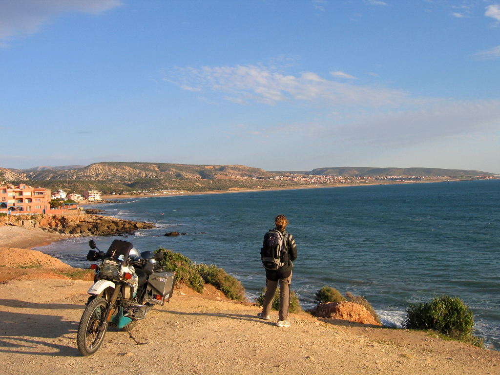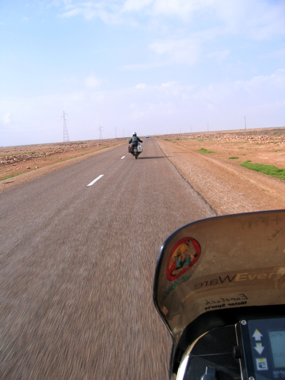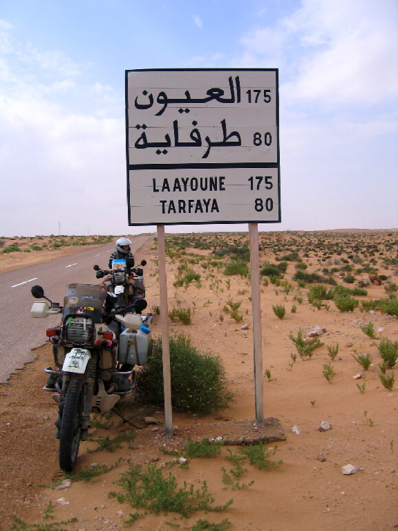 Then came Tan Tan, this was the actual destination of this little sojourn. I had seen the name on a map and told Cecilia that we should go there, so went we did. Unfortunately there wasn't any camping in Tan Tan, so we continued a bit further to Tan Tan Plage. I wasn't actually interested in the town, I just wanted a photo of the town name (which incidentally, I didn't take, since a more interesting one presented itself, see pictures). Tan Tan Plage, was a sleepy town, with no real camping spot other than the road next to the beach, and a little "residence", where they let you camp on the grounds. (See Camping Morocco for more info). Since it was Sunday and our weekly call home is today, we went into town looking for a telephone which took prepaid cards. We found one, it didn't work, or was busy. So we went to the next one, this one didn't recognize the card. Ok, next one, no dial tone. Back to the first one, still busy or no signal. This went on for around 30 minutes. Everyone in town watching these two foreigners on a motorcycle, riding back and forth in town, from phone to phone. In the end we ended up using a pay phone in a call center which are ubiquitous to Morocco, every town has at least one little shop, with a number of payphones, which are privately run. The call went through without any problems, and turned out to be very reasonable.