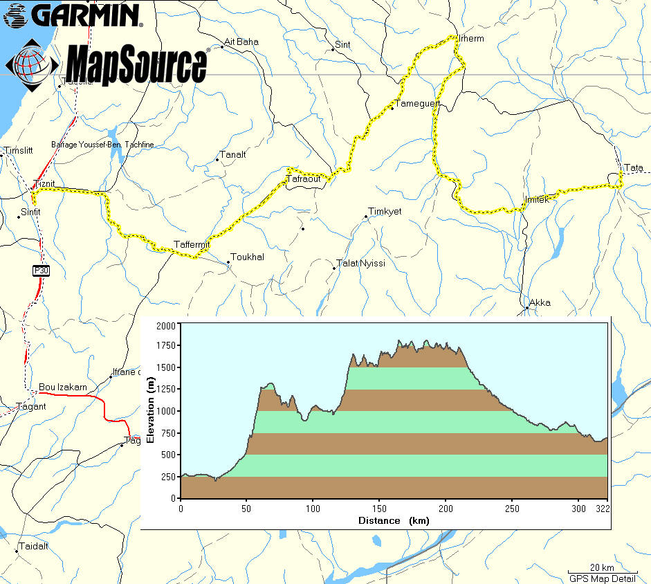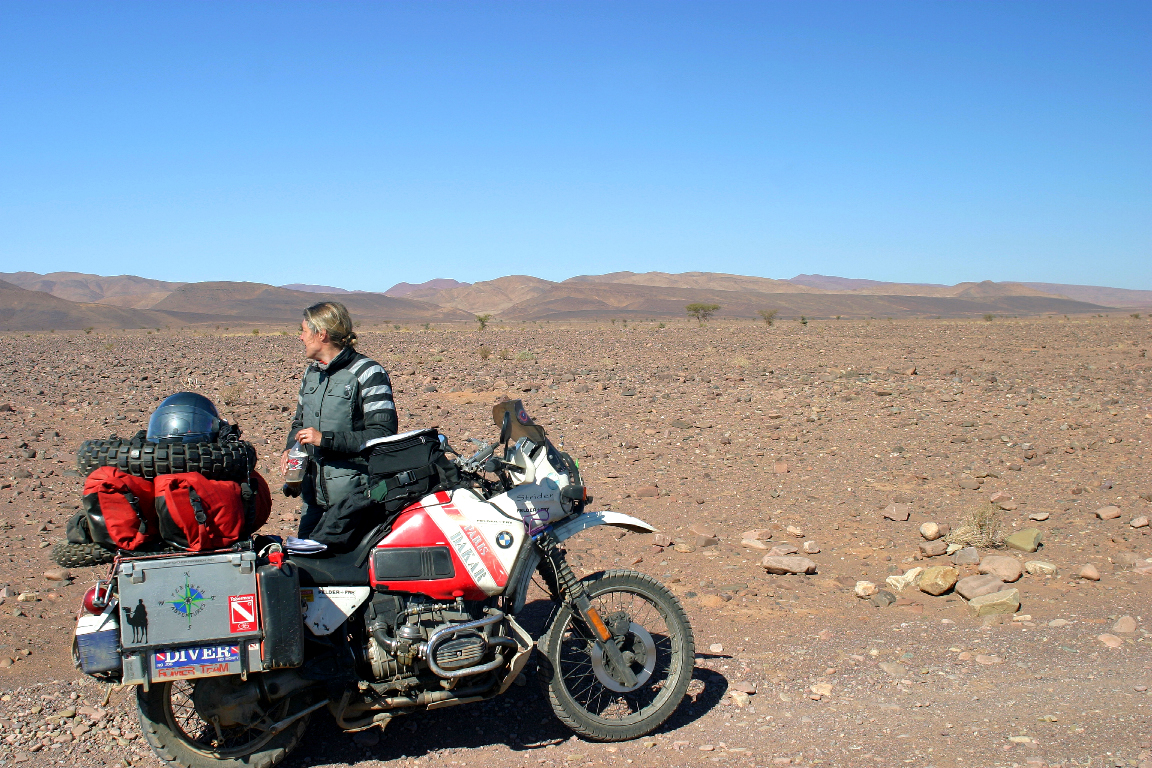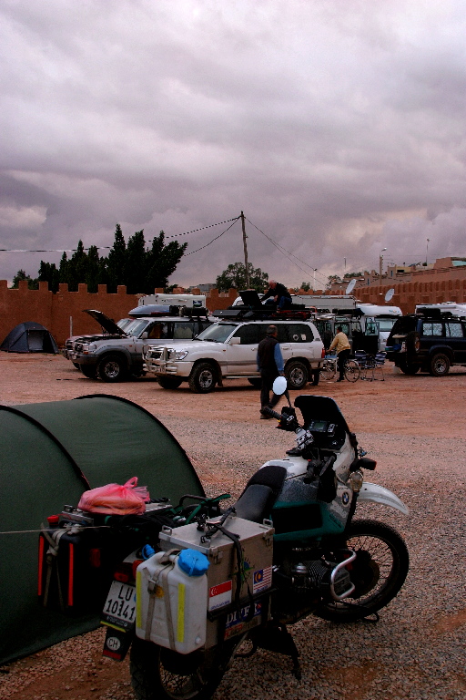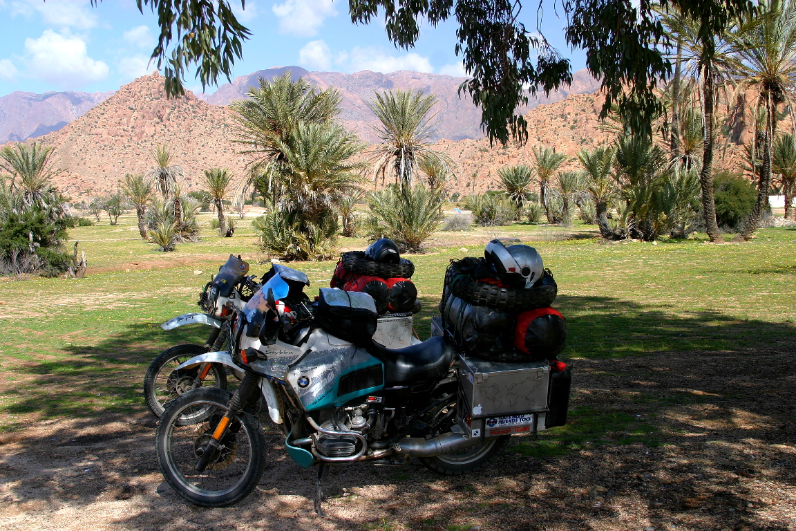 | From Tata we headed to Zagora, and we decided to take the N12 which according to Sahara Overland by Chris Scott (which had been lent to us by Martin) was a very rocky piste through some not very interesting country! He was right, it was very, very rocky, the country was ok, basically just flat flood plain, between two sets of "hills". | The piste part took us 4.5 hours in total, with 3.5 hours riding to go 120km. A couple of crashes, but nothing too spectacular. One thing though, I am not so sure I would want to do it in the middle of summer. The first part of the road was great, as they are working on paving it, so it is flat and fast, but after 20km, the going got very slow, and hot. |